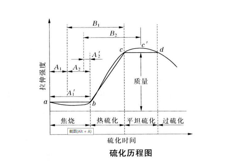 處于正硫化階段中,膠料的物理機械性能能保持最高值或略低于最高值。但許多膠料其各項性能在某一時間不可能都處于最佳值。如橡膠的撕裂強度、耐裂口性能在達到正硫化時間前稍微欠硫時最好;橡膠的回彈性、生熱性、抗溶脹性能和壓縮永久變形則在輕微過硫時最好;而膠料的拉伸強度、耐磨及耐老化性能則在正硫化時最好。因此,正硫化時間的長短不僅與膠料的配方、硫化工藝方法、硫化溫度和硫化壓力等有直接的關系,而且受到所考察的某些主要性能的影響。這種以物理機械性能為考察對象,即物理機械性能處于最高值或接近最高值時的硫化狀態稱為工藝正硫化,對應的正硫化時間稱為工藝正硫化時間。