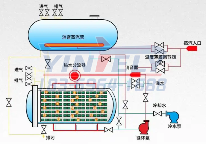 操作流程分為四步:1、蒸汽加熱:利用蒸汽迅速提升釜內(nèi)水的溫度,直至達到設(shè)定溫度;2、循環(huán)保溫:運用循環(huán)泵使熱水持續(xù)循環(huán),保證溫度均勻分布;3、完全浸泡:將產(chǎn)品完全浸入熱水中,通過熱傳導(dǎo)在121℃的條件下殺滅微生物;4、能源回收:殺菌結(jié)束后,把熱水回收到工藝罐中,實現(xiàn)循環(huán)利用。